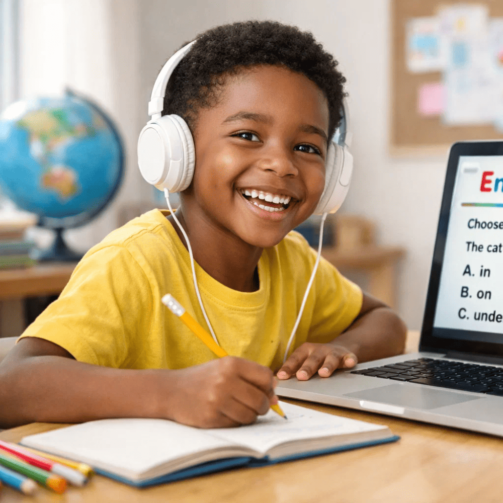 Structured English classes for kids online, combining speaking practice, reading, and age-appropriate grammar.