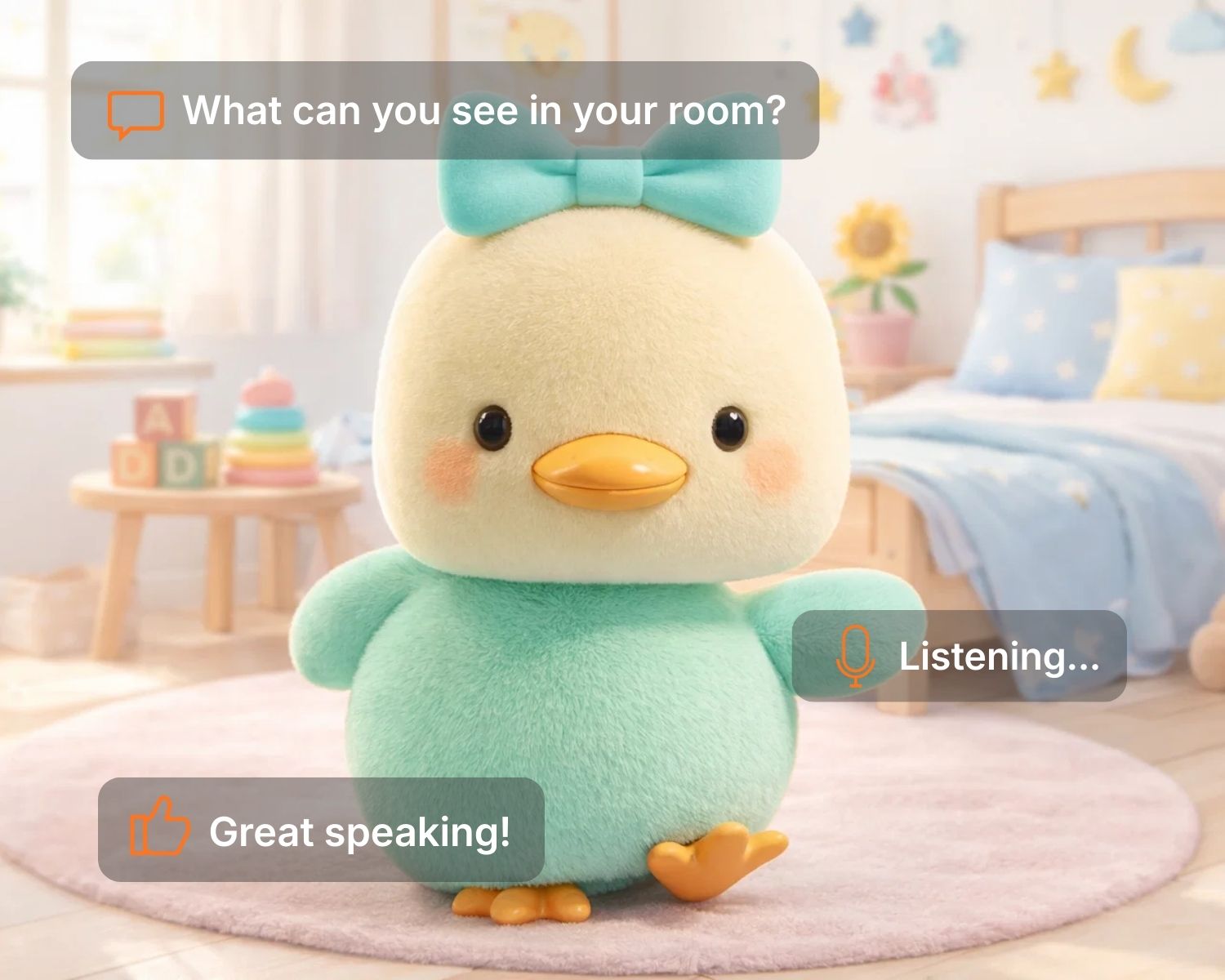 아이들의 이야기를 귀기울여 듣고, 친근하고, 따뜻한 대화로 아이들이 매일 자신 있게 말할 수 있도록 도와주는 친근한 AI 펫입니다.